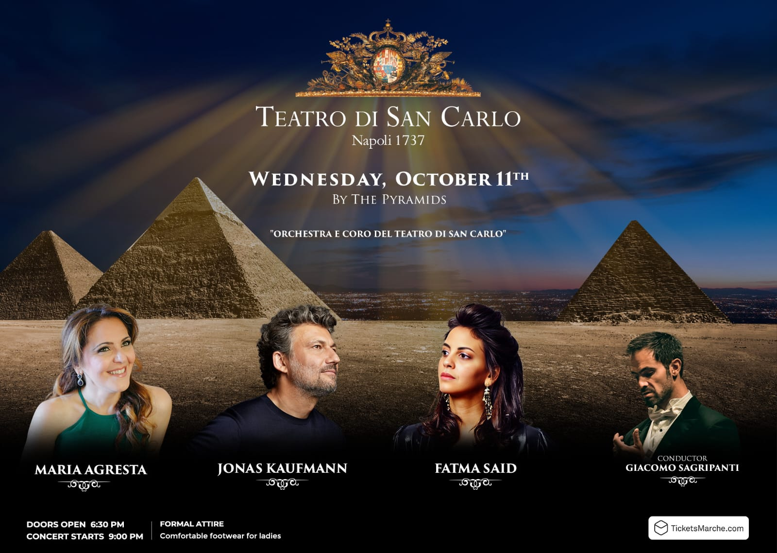 لذا، استعدوا لتُفتح أمامكم أبواب السحر مع تياترو دي سان كارلو في مصر. فهو يكتب التاريخ أمام أبهى خلفية ممكنة وهي أهرامات مصر الرائعة. إنها مناسبة تعد بأن تكون مزيجًا رائعًا من الثقافة والموسيقى والتسلية الخالصة. لا تفوتوا هذه الليلة التي ستضيء سماء مصر الرائعة!