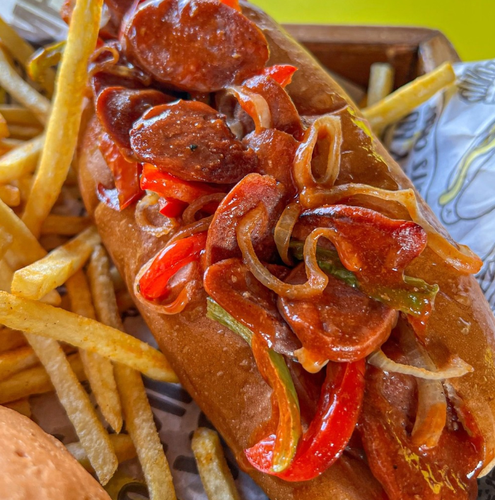 With multiple locations across the country, Daddy’s Burger knows how to throw a hotdog party. Enjoy grilled hot dog slices, green and red bell peppers, chili hot sauce, onions, and barbecue sauce – a flavor fiesta!